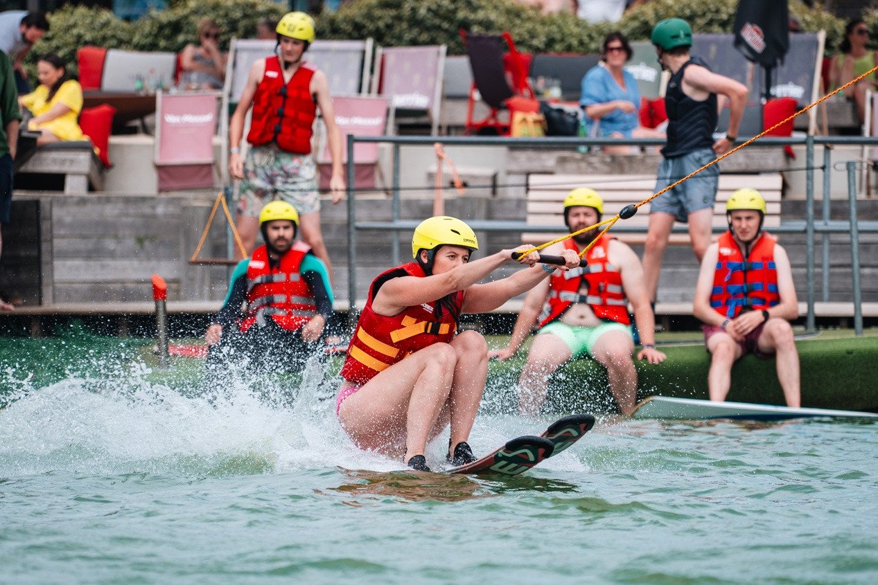 Outside, a fully equipped BBQ area, a Tiki bar and a sandy beach overlook the beating heart of the site: three cable systems for waterskiing, wakeboarding and kneeboarding, with runs for beginners, rookies and professionals. You can also go stand-up paddling or kayaking. Do you prefer to stay on dry land? No problem! There are plenty of cycling and walking routes, as well as a fitness trail around the lake. The site also houses two meeting rooms and a sports hostel with 80 beds, while several renowned hotels are within walking distance.