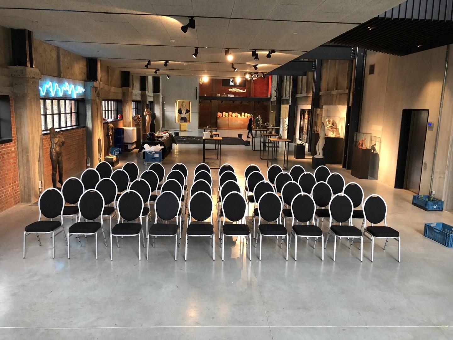 We offer up to 100 simple chairs for rent at 2 euros each. We will set them up in the arrangement agreed upon in advance (e.g., theater, square, U-shape, classroom, cabaret setup, etc.). Note: Art Center Hugo Voeten does not have tables and/or specialized furniture such as sofas, bars, meeting chairs, etc. If you require and need this type of furniture for your event, you should contact the caterer or a rental company to arrange this for you.