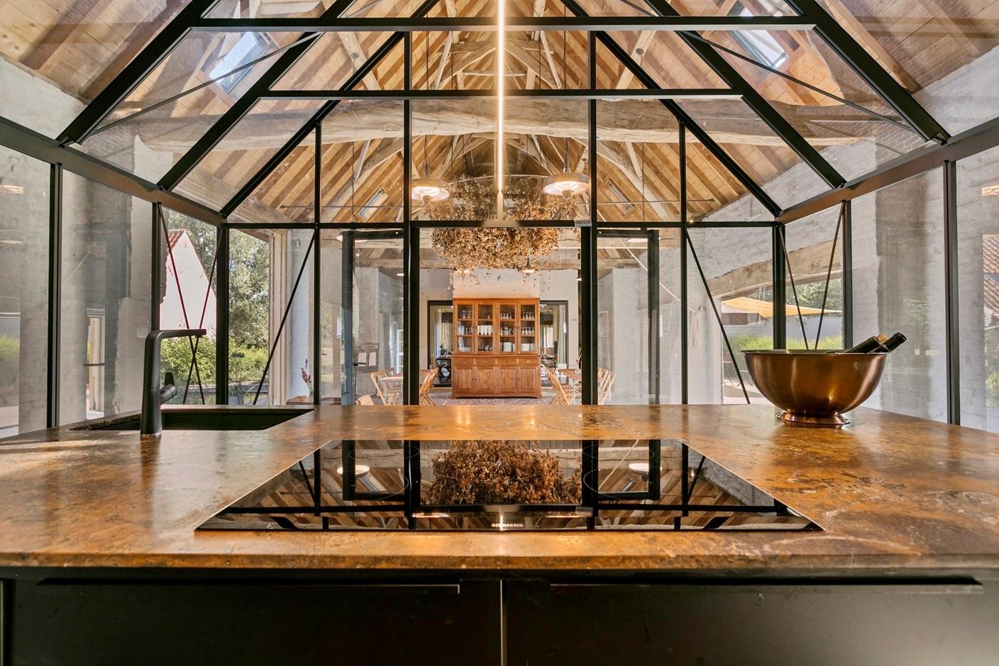 Ce qui rend cet endroit surprenant, cependant, c'est qu'ils y ont installé une serre, avec un grand îlot de cuisine moderne qui peut être utilisé pour des cours de cuisine, mais aussi bien sûr pour des dégustations de vin ou de whisky.